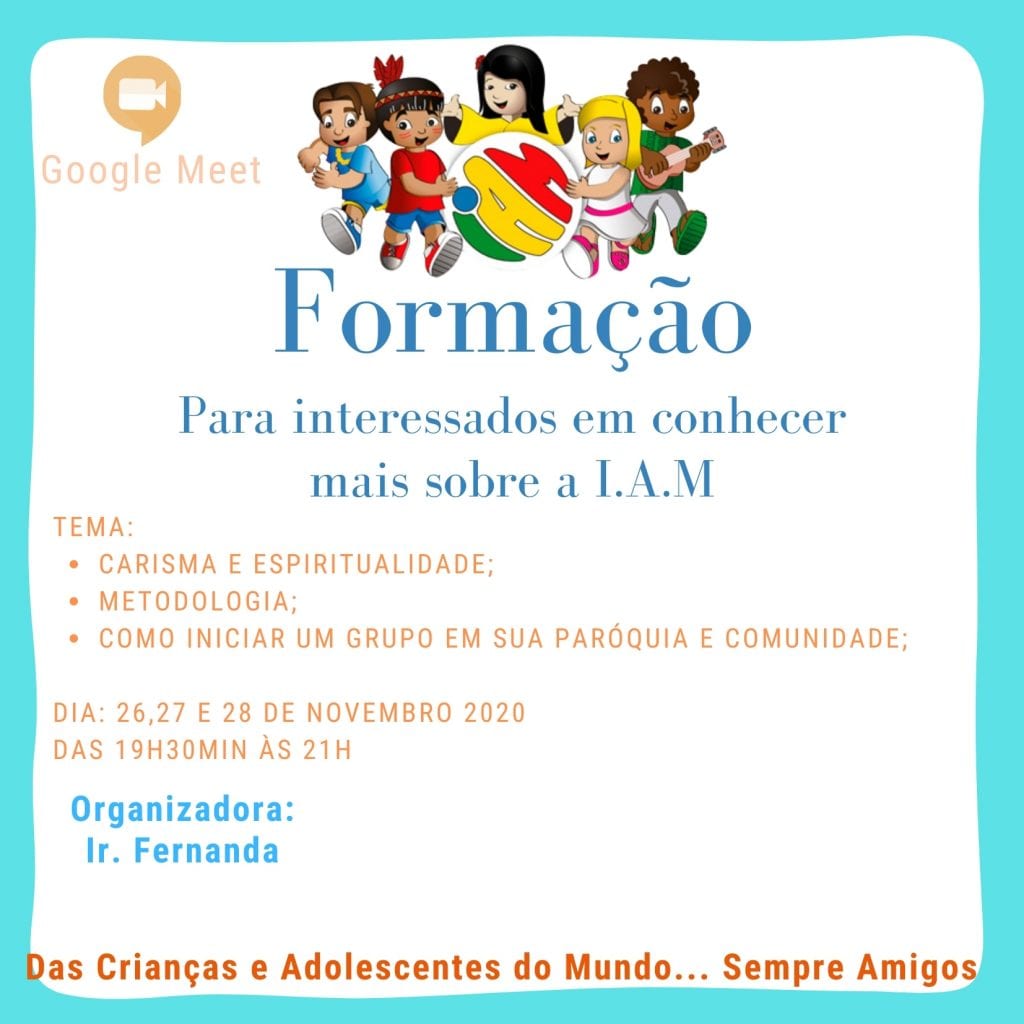 Nos dias 26,27 e 28 de Novembro 2020, estará ocorrendo uma formação para conhecer melhor o IAM (infância e adolescência missionária), ocorrerá a partir das 19h30min às 21h. Será dividido em 3 etapas, com seus respectivos temas: Carisma e espiritualidade; metodologia; Como iniciar um grupo em sua paróquia e comunidade; A reunião será transmitida pela […]