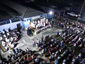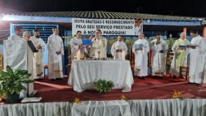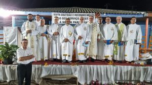 graças alcançadas. Nossa gratidão a Deus por nos agraciar com a dadiva de poder testemunhar o ardor do fecundo ministério presbiteral do Pe. Francisco. Eu lamento não poder estar pessoalmente convosco nesta festa que envolve a todos; porém o nosso presbitério e toda a Diocese de Guajará-Mirim se irmana a você Pe. Francisco, neste reconhecimento e louvor pelos caminhos palmilhados na vida desta Diocese, começando na Igreja Catedral de Nossa Senhora do Seringueiro em Guajará – Mirim, São Francisco do Guaporé, Seringueira e agora no antigo e novo amor São Miguel do Guaporé. Em tudo, percebemos um coração tão embrenhado e pulsante no nosso meio, que percorrendo as regiões que tiveram a graças de desfrutar do seu cuidado de pastor, o que eles testemunham é fascinante quando falam: “das distancias enfrentadas, do começo de tudo neste chão amazônico, da velha bicicleta enlameada e carregada no ombro, chegava de qualquer jeito, um missionário companheiro e amig0 sempre presente…” Além da missão pastoral, entre tantos talentos, você sabe contemplar e ler o céu estrelado, com destaque para a estrela do oriente nos finíssimos cartões trabalhados em três dimensões com as palhas e folhagens que recolhe por onde passa. Um artista nato! Parabéns Pe. Francisco! Obrigado por tudo! Que o Divino Mestre o continue cumulando de bençãos e graças para bem servi-Lo. Receba minha benção! Rogo também sua benção para mim e toda a nossa Diocese de Guajará-Mirim.
