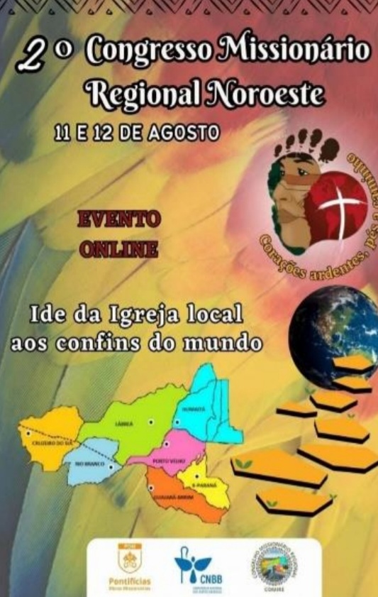 A Cidade de Manaus, de 10 a 15 de novembro, acolhe o 5o Congresso Missionário Nacional sob o tema: “Ide! Da Igreja local aos confins do mundo” e o lema: “Corações ardentes, pés a caminho a caminho”. E em vista de contribuir com esta importante temática para Ação Evangelizadora da Igreja, o Conselho Missionário Regional (COMIRE) realizará nos dias 11 e 12 de agosto, o 2o Congresso Missionário Regional Noroeste, de forma online pelo aplicativo Zoom, com a assessoria do Conselho Missionário Nacional (COMINA). Haverá reflexões sobre a responsabilidade da Igreja local, temática do 3o Ano Vocacional, Missão Ad Gentes e testemunhos missionários. Inscrições para o congresso através do link https://docs.google.com/forms/d/1dkHIcBBYYrYxUsKrO0ovt4HSmAoEFMB2WN39zlDyBLM/viewform edit_reque sted=true