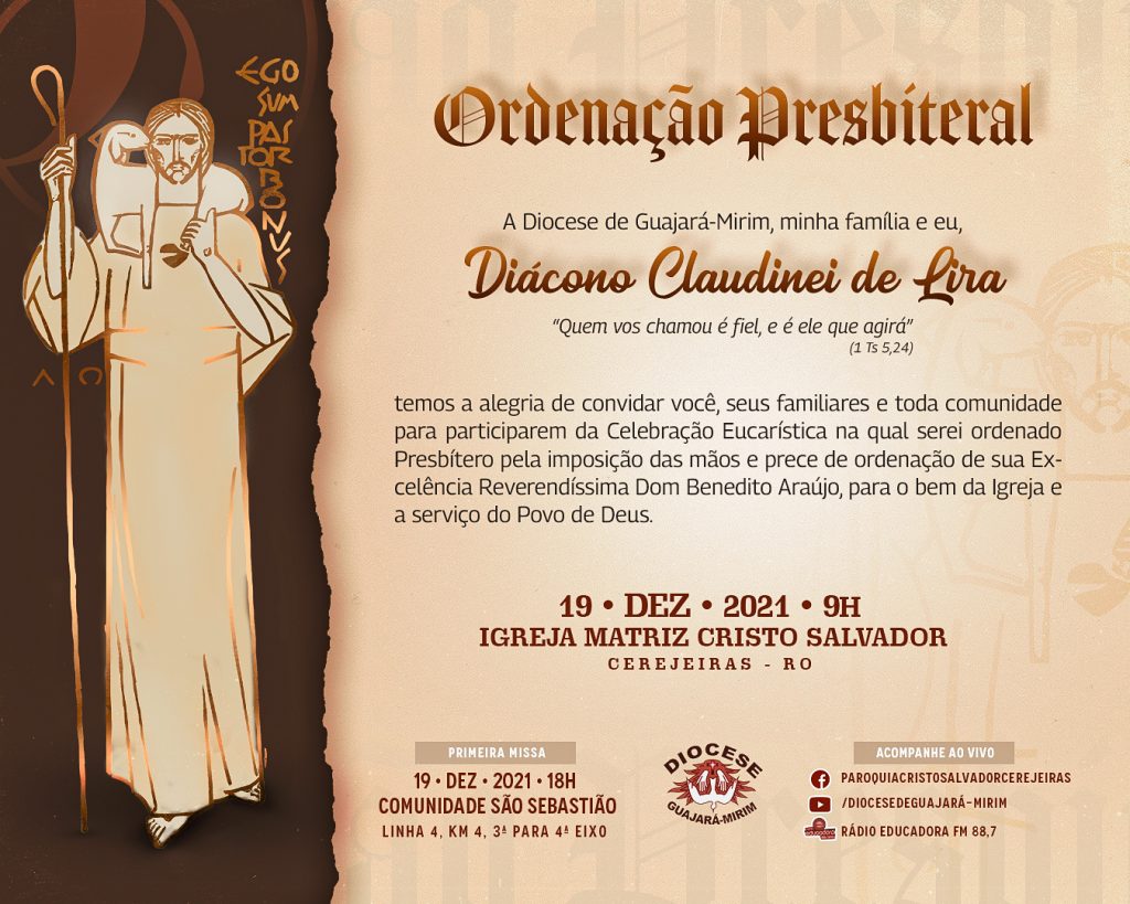 A Diocese de Guajará-Mirim convida todo o Povo de Deus para participar da Celebração Eucarística na qual o Diácono Claudinei de Lira será ordenado Presbítero pela imposição das mãos e oração consecratória de Dom Benedito Araújo.