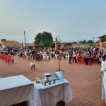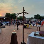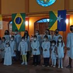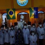 Antes de encerrar a celebração aconteceu a coroação de Nossa Senhora Aparecida que foi introduzida em cortejo pelos corredores do meio do povo por uma mulher enquanto se cantava. Em seguida, veio uma procissão de crianças vestidas de médicas e enfermeiras, que em uma encenação simbólica nos emocionou demonstrando o cuidado com aqueles que estavam doentes. Isso nos recordou e simbolizou uma homenagem aos profissionais da saúde que neste tempo pandêmico tem desempenho um papel muito importante em nossa sociedade.