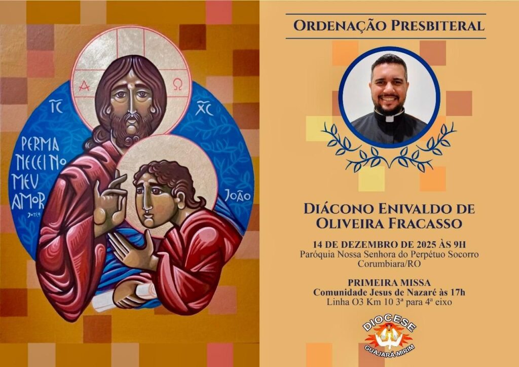 Com imensa alegria e gratidão a Deus, convidamos a todos para participarem deste momento tão especial na vida do nosso irmão Enivaldo de Oliveira Fracasso, que será ordenado presbítero para o serviço da Igreja e do povo de Deus.