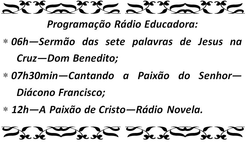 - Narração da Paixão (Beijo da Cruz) – na Catedral e nas comunidades às 15h00min, em seguida reza do Terço (Mistérios Dolorosos) / Via Sacra.