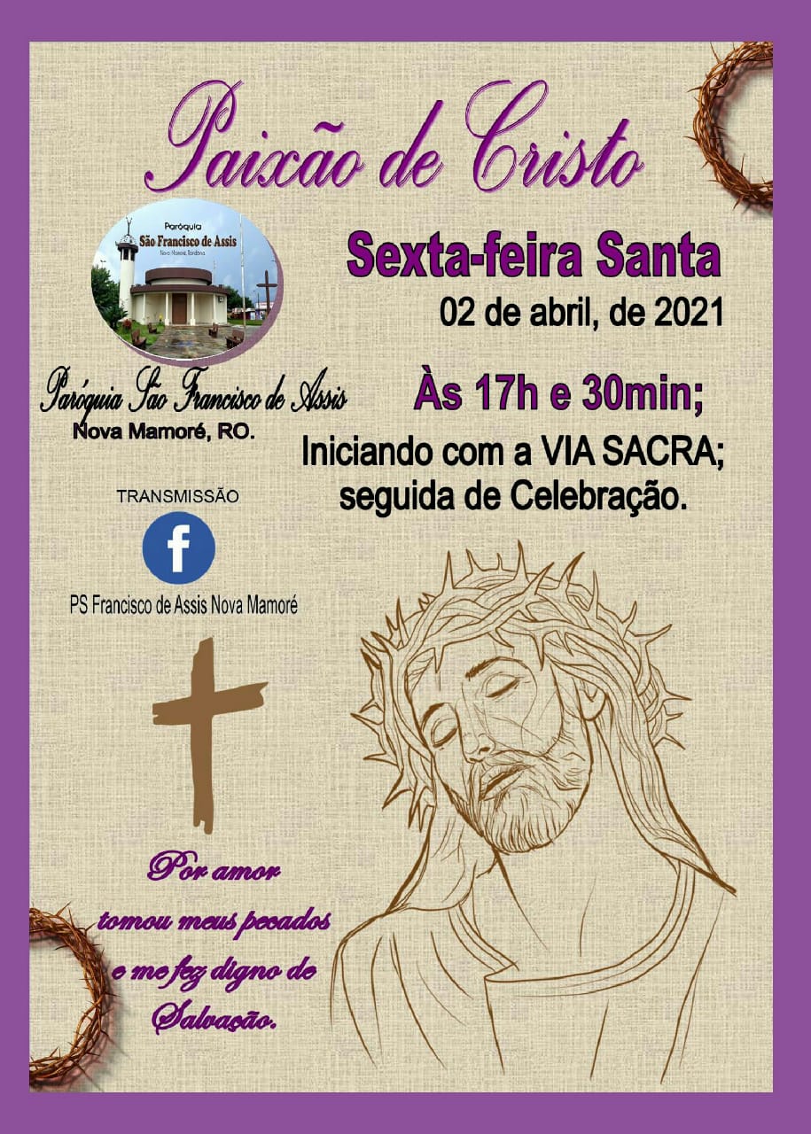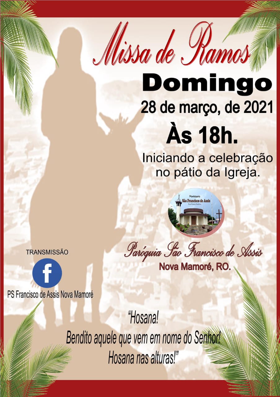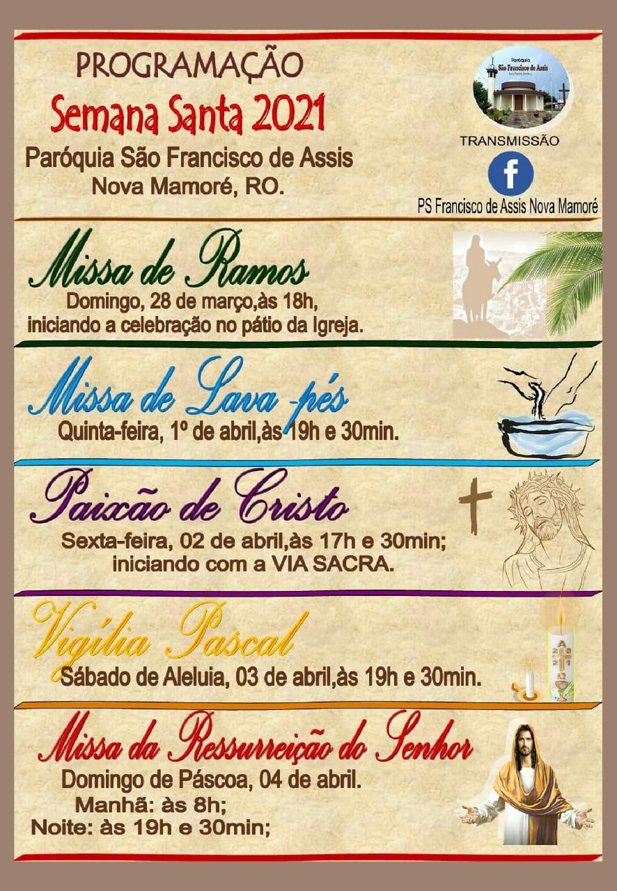 Paróquia São Francisco de Assis em Nova Mamoré/RO preparou uma programação completa, dentro do que a pandemia permite. E para que todos possam viver os momentos da Semana Santa, AS CELEBRAÇÕES SERÃO TRANSMITIDAS AO VIVO pelo canal da paróquia no Youtube