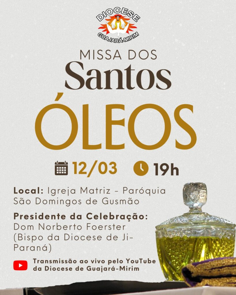 A celebração acontecerá nesta  quinta-feira, 12 de março de 2026, às 19 horas, e será presidida por Dom Norberto Foerster, bispo da Diocese de Ji-Paraná. A Missa dos Santos Óleos reúne sacerdotes, religiosos e fiéis em um importante momento da vida da Igreja, no qual são abençoados os óleos utilizados nos sacramentos ao longo do ano.
